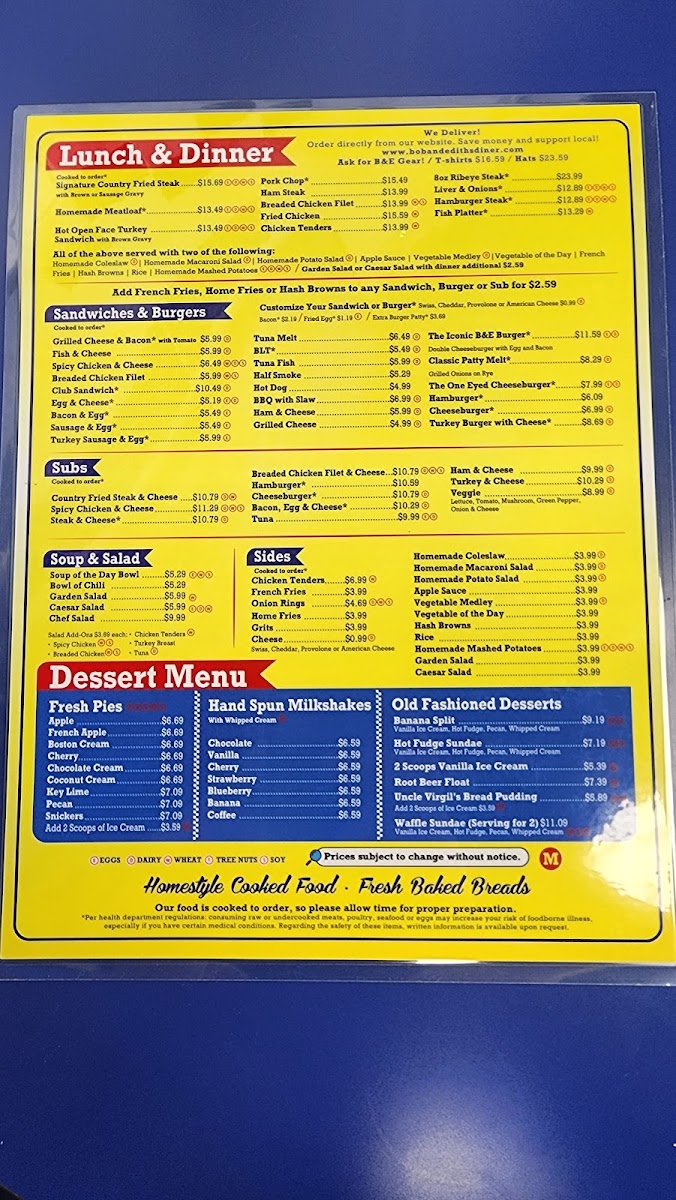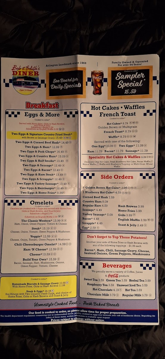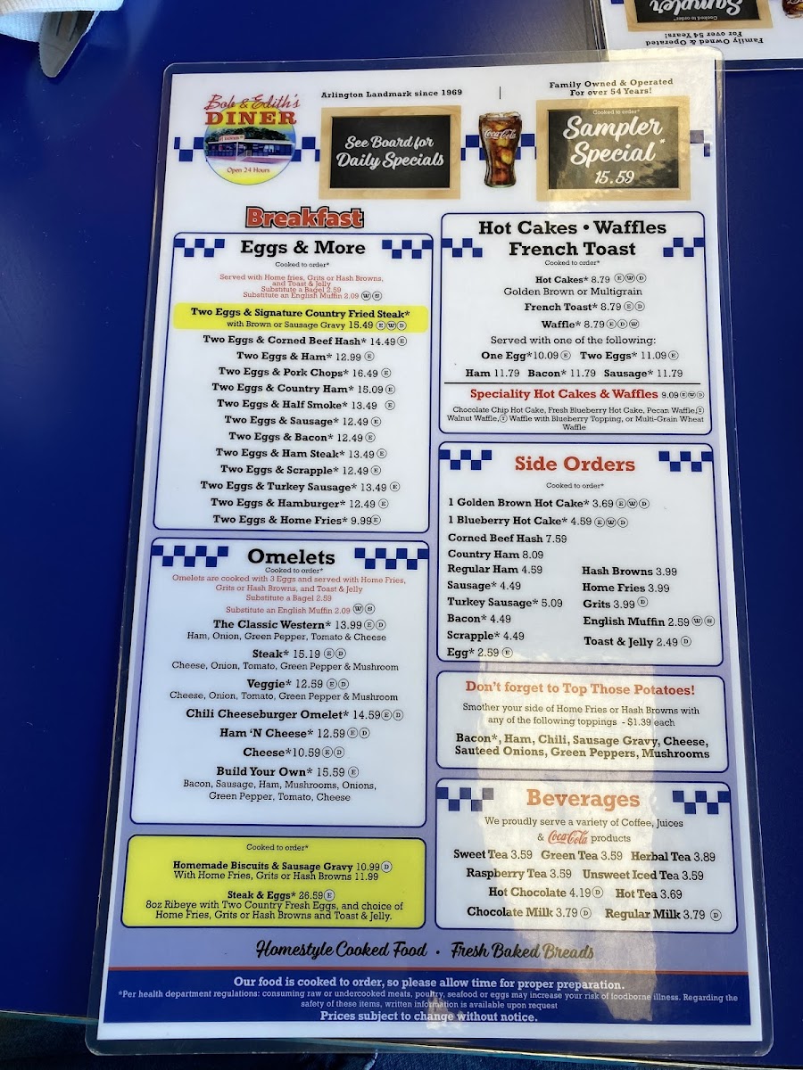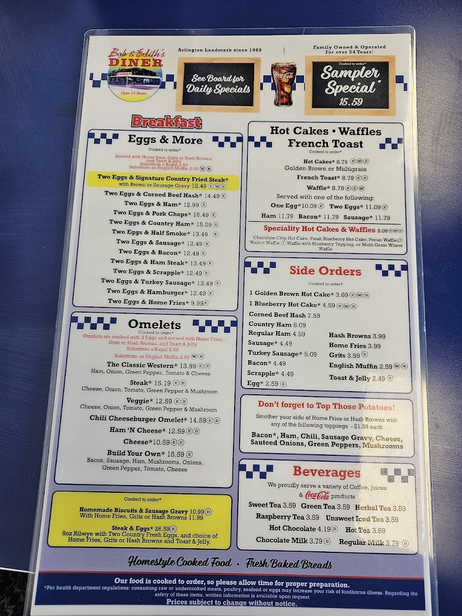 Ham, egg, and your choice of cheese on various breads (biscuits, rye, wheat, white, English muffin, bagel, bun).