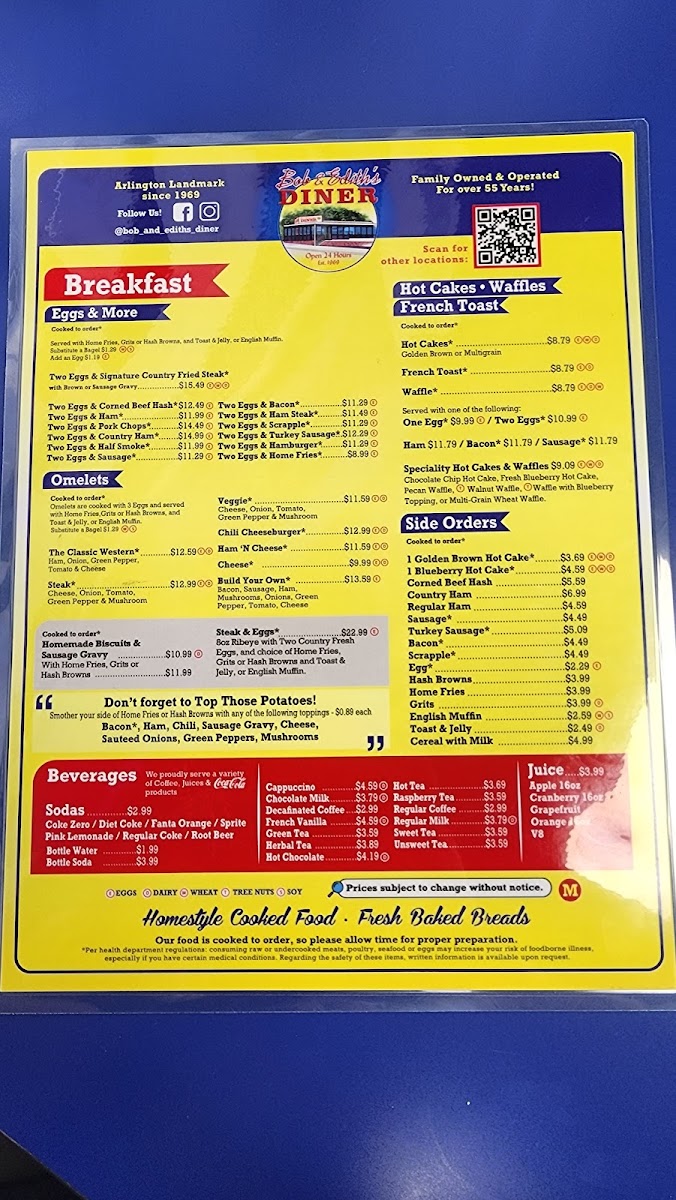 Juicy tomatoes and fluffy eggs. Side options: French Fries, Hash Browns, Home Fries, Grits, Fresh Fruit, and more. Bread choices: Biscuit, Rye, Wheat, English Muffin, Bagel, and Bun.